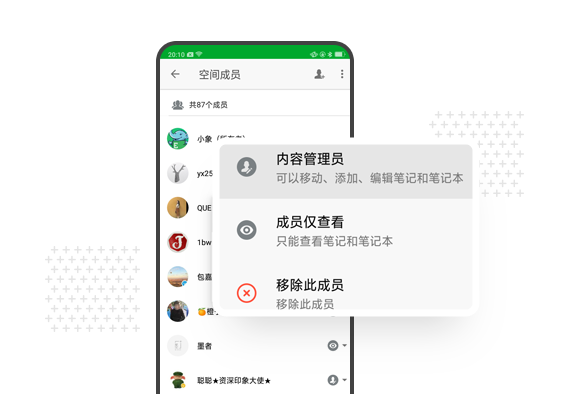 你可以为空间设置权限,也可以管理空间内每一位成员的权限。在发出空间邀请前,可设置“知道空间的任何人可加入”、“加入空间需要申请”或是“关闭邀请链接”。你也可以为空间内的每一位成员设置角色权限:设置内容管理员、成员仅查看或是移除该成员,多重权限管理,满足不同协作需求。