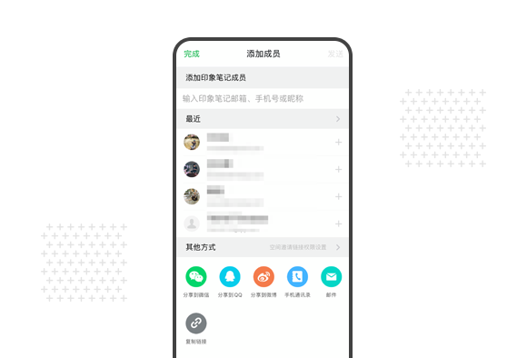 不同于过去仅支持通过印象笔记邮箱进行共享的流程,印象笔记内的共享方式也进行了全新的优化和升级。升级后的共享体验将更加灵活,支持通过印象笔记的邮箱、手机号或昵称将空间共享给好友,也可以通过微信、邮件或链接的形式直接发出空间邀请。