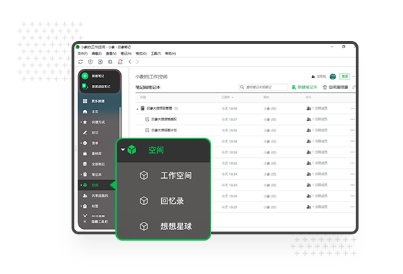 「空间」是印象笔记内全新的知识管理结构和协作方式:你可以使用空间功能管理笔记和笔记本,将“空间”内的笔记内容共享给好友,还可以与好友在空间内进行协作!空间功能的上线,是对笔记组织结构的全新升级,也是对笔记共享与协作体验的全面优化和升级。