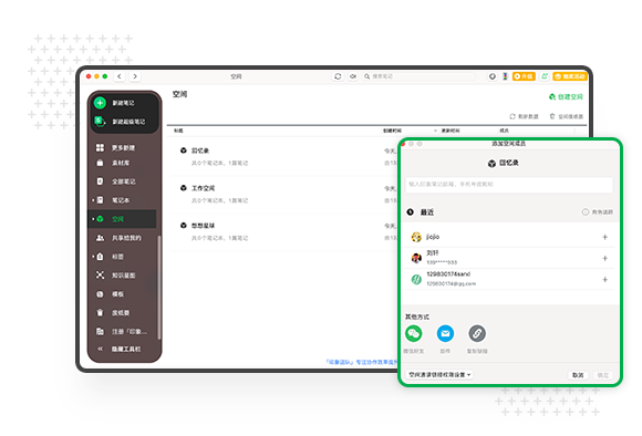 你可以将某个空间共享给好友或团队,与联系人一起共享信息、沉淀知识。共享后该空间内的所有笔记和笔记本将同时共享给联系人。联系人可以加入空间浏览你共享的笔记信息,还可以使用编辑权限添加、修改及编辑空间内的笔记信息。空间资料的更新也将同步给所有空间成员。